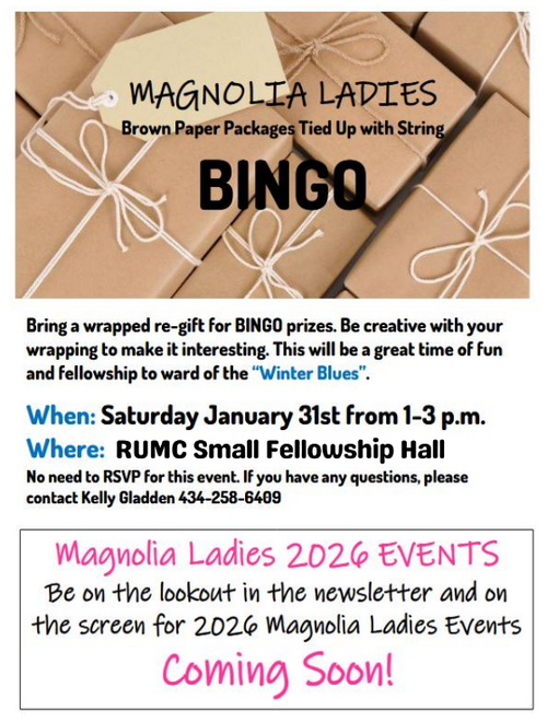 Saturday January 31st: Magnolia Ladies Brown Paper Packages Tied up with String BINGO